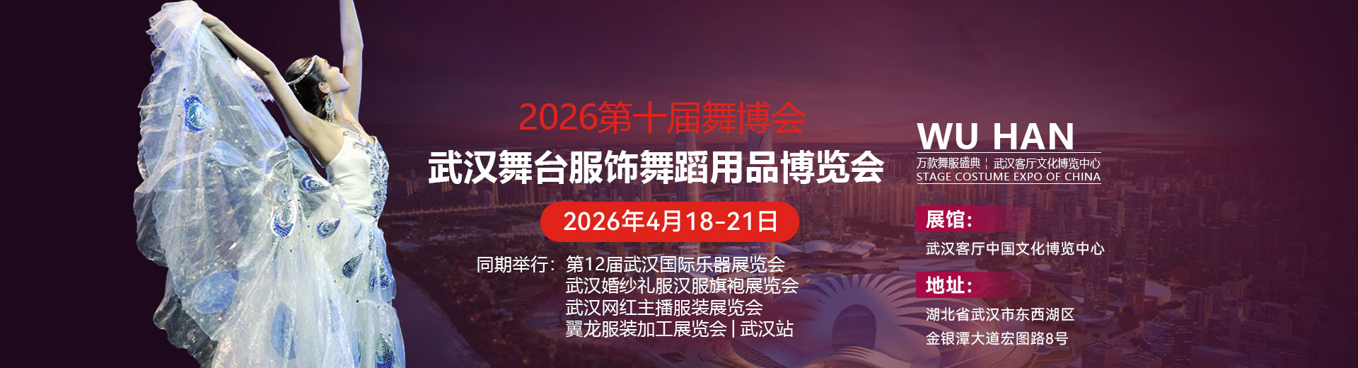中国(武汉)舞台服饰舞蹈用品博览会,自2015年起举办,是目前国内唯一的舞台演艺服饰、舞蹈服饰及用品、艺术服饰、民族服饰、汉服礼服、体服练功服等服饰的专业展览会。每年参展的近200家服饰厂商,在10000多平方米的展览区域,展示数万款最新设计的精美舞服,新款爆款荟萃,引领行业潮流,全国客商云集,共造舞服年度商贸交流盛会。对厂家和商家来说,聚集在舞博会,既是参展销售拓展商机,展示企业实力和设计风格制作工艺,亦可跟进市场变化,了解新技术新工艺新材料,挑选定制服饰,交流设计创意,储备厂商和款式资源,提前充分准备,抢占市场先机。